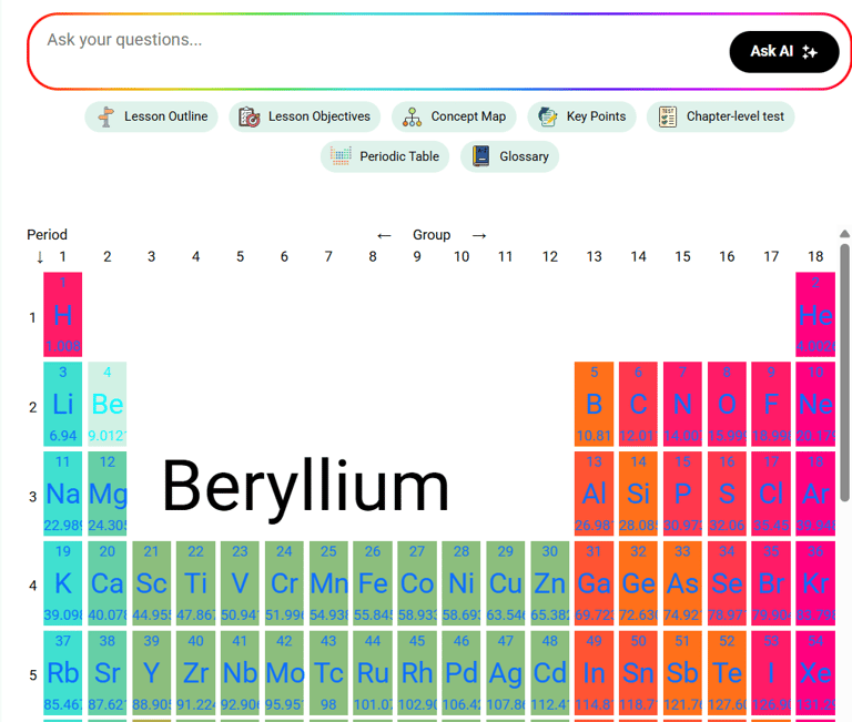 Follow smart study plans tailored to your progress, ask questions instantly, and get your competency evaluated by AI — all while exploring interactive tools like concept maps and 3D periodic charts.